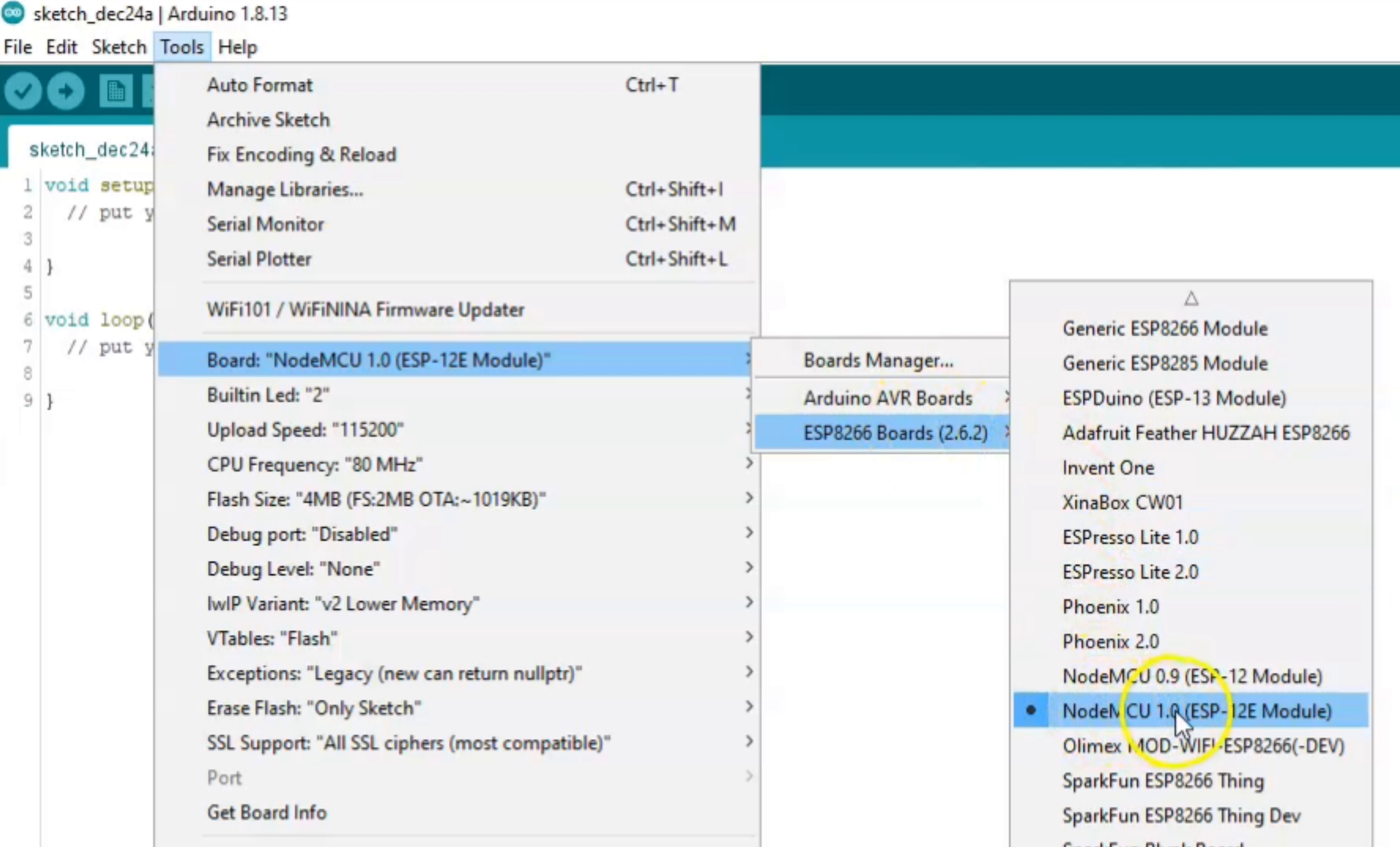 Step10: Now go to tools then "Board" then esp8266 boards and select "NodeMCU 1.0 (ESP-12E Module)".